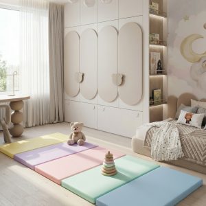 structure provides a cushioned surface that reduces the risk of bumps, while the modular pieces encourage
